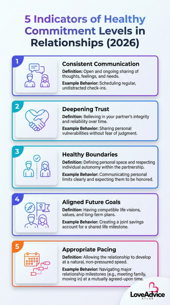 A concise visual summary of the five indicators of healthy commitment levels in relationships for 2026.