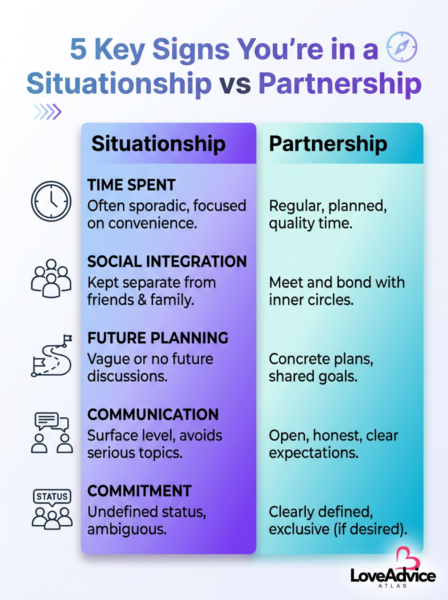 Five key signs distinguish a situationship from a partnership. Learn how commitment, communication, and boundaries shape your relationship status.